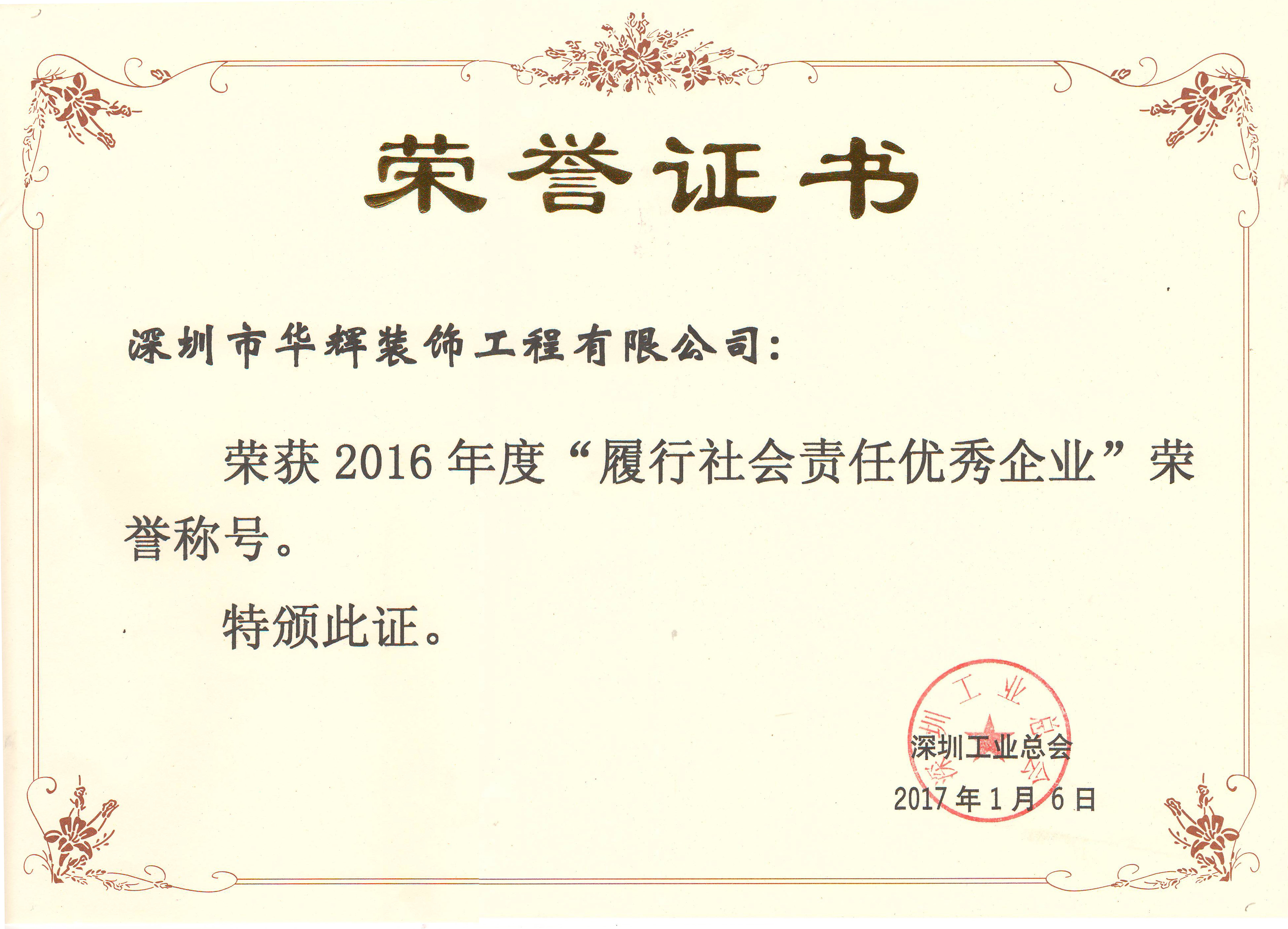 近日,深圳工業總會2016年度年會暨第十五屆深圳企業創新紀錄成果發布會在五洲賓館隆重舉行。會議上表彰了深圳工業總會“功勛會員”、“杰出會員”和履行社會責任“杰出企業”、“優秀企業”。深圳市華輝裝飾工程有限公司喜獲“履行社會責任優秀企業”殊榮。