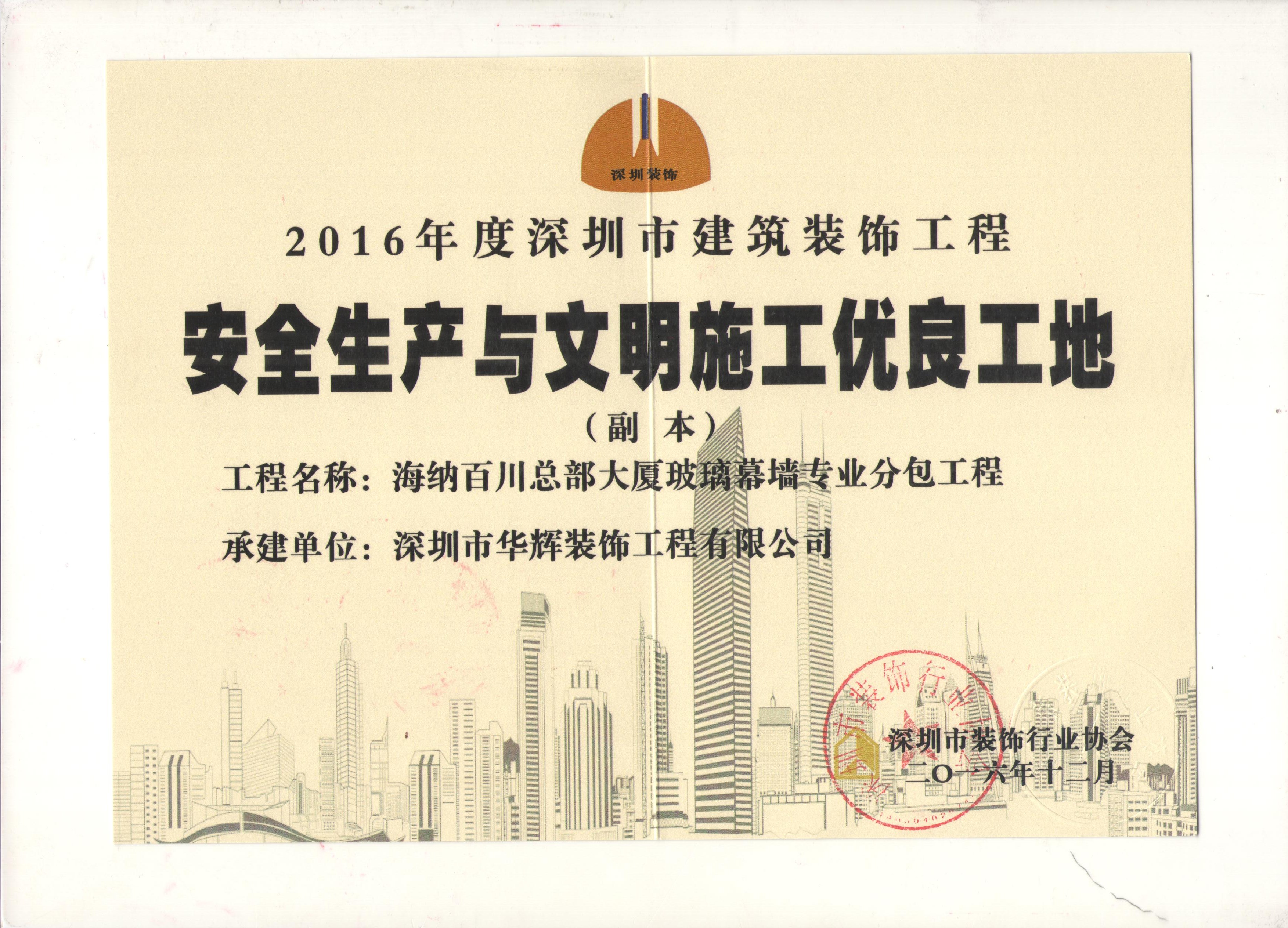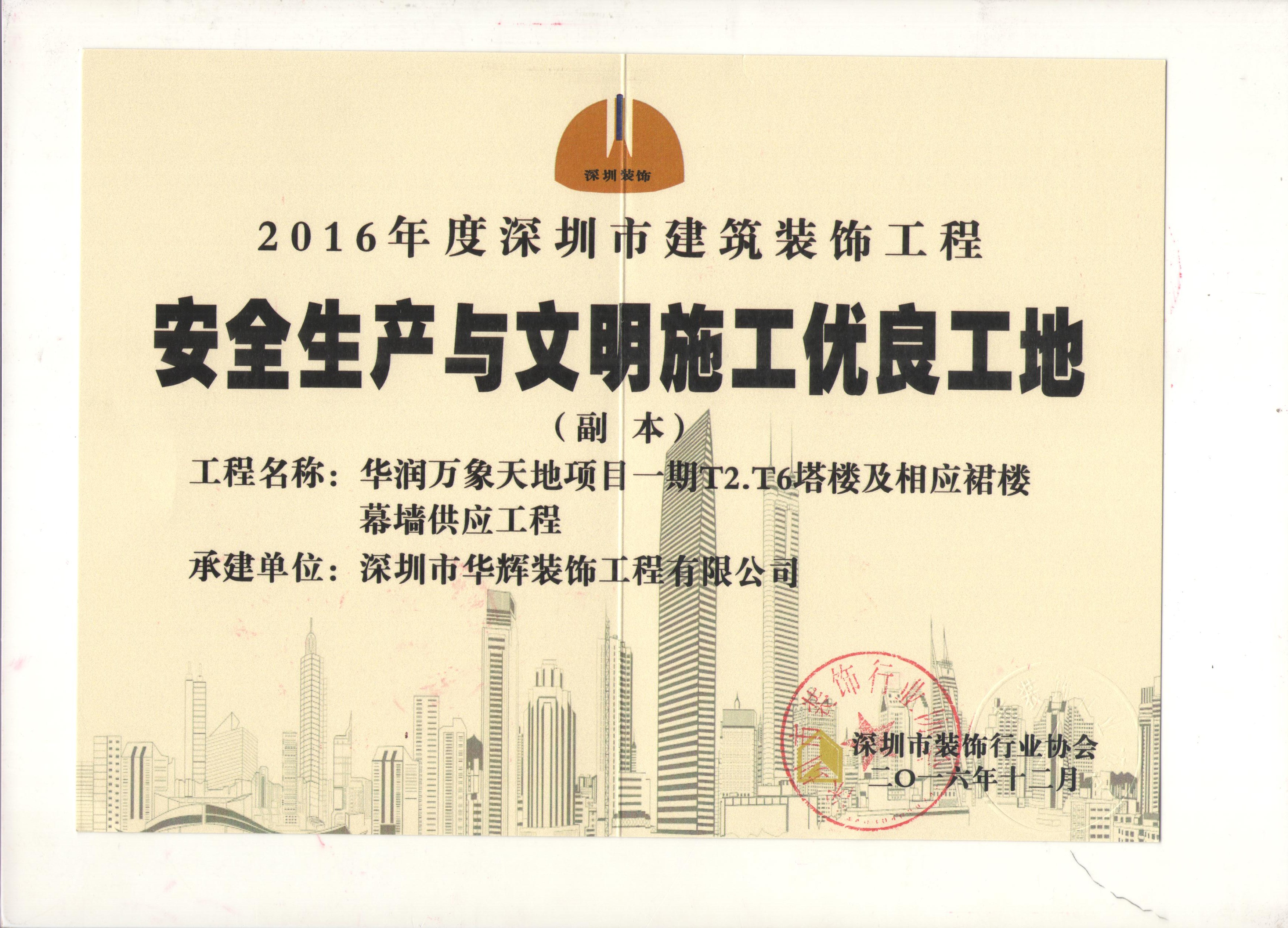 近日,深圳市裝飾行業協會發布“2016年度深圳市建筑裝飾工程安全生產與文明施工優良工地”評選結果,深圳市華輝裝飾工程有限公司擔綱的海納百川總部大廈幕墻專業分包工程、華潤萬象天地項目一期t2.t6塔樓及相應裙樓幕墻供應工程成功入選。