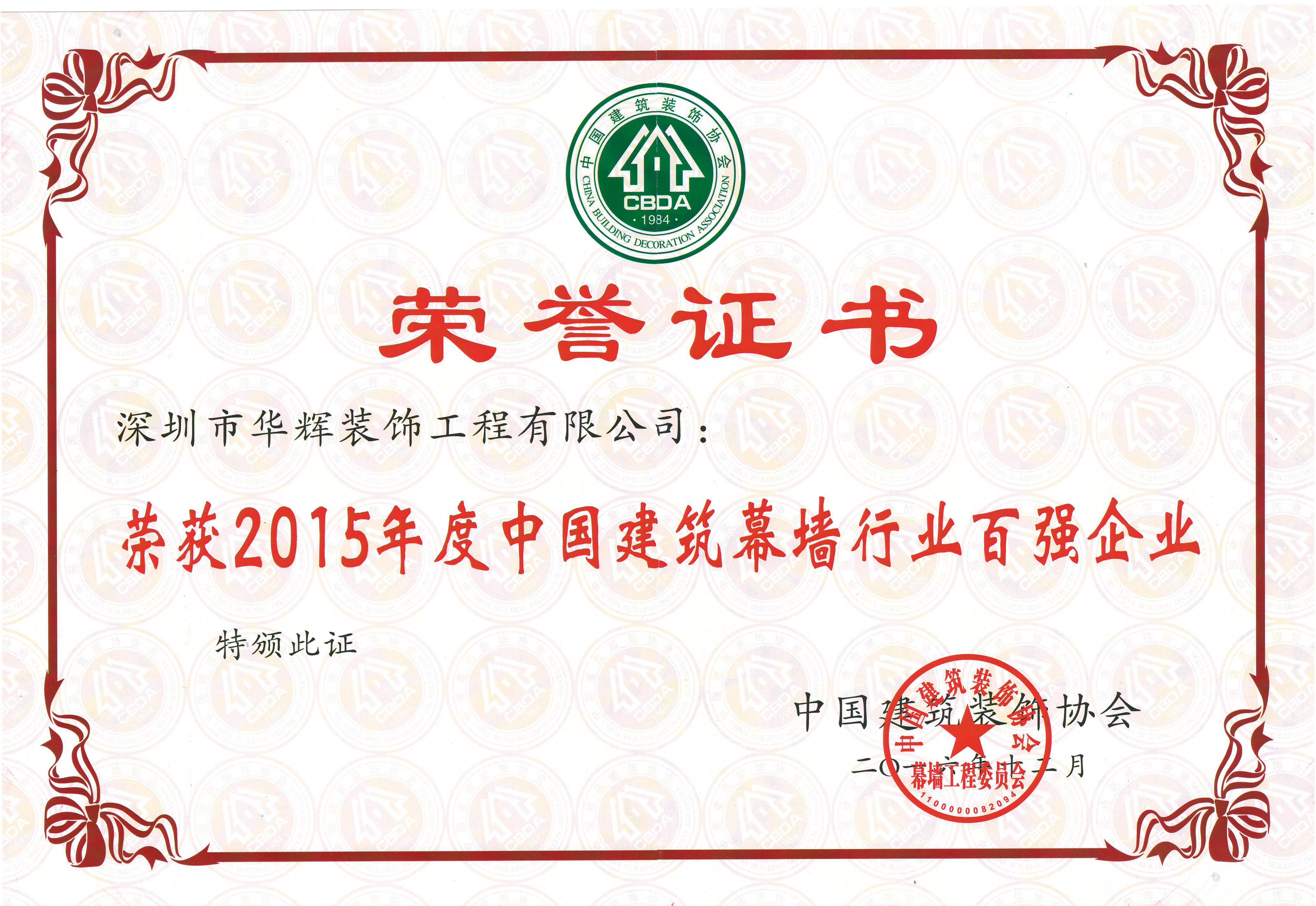 在2015年度中國建筑幕墻行業百強企業評價推介活動中,深圳華輝裝飾憑借強硬的幕墻設計施工實力和豐富的幕墻業績,成功入選百強榜單,進一步提升了企業的品牌價值和市場知名度。