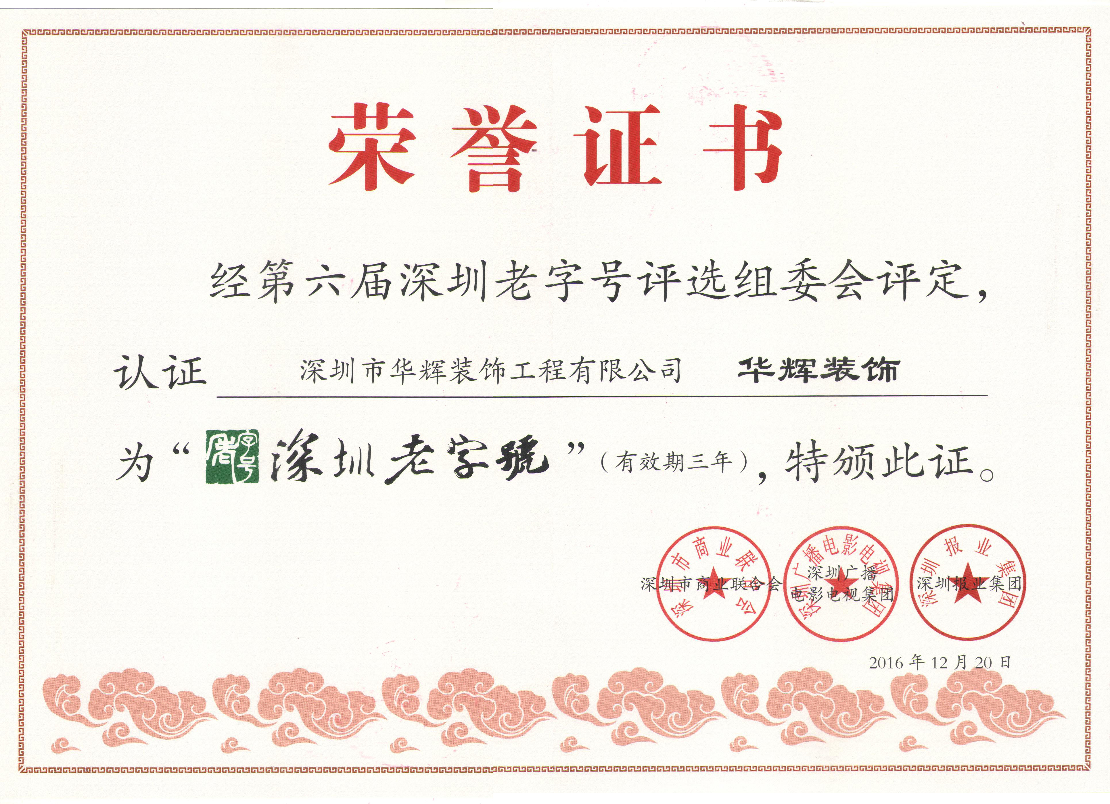 近日,由深圳市商業聯合會、深圳廣播電影電視集團、深圳報業集團共同主辦的第七屆“深圳老字號”評選結果正式揭曉,深圳華輝裝飾在眾多評選企業中脫穎而出,榮獲“深圳老字號”稱號。 “深圳老字號”承載著深圳城市發展的歷史記憶,彰顯了伴隨改革開放成長起來的深圳企業發展歷程,它的背后有著強烈的深圳色彩和價值認同。其評選參照中華老字號專業委員會的相關標準,遵循“歷史、特色、形象、影響”四大評選標準,經過實地考察、網絡投票等進行綜合考評。最終,深圳華輝裝飾作為老牌裝飾企業,憑借34年的發展歷史和良好的美譽度及廣泛的知名度,榮獲“深圳老字號”的榮譽稱號!
