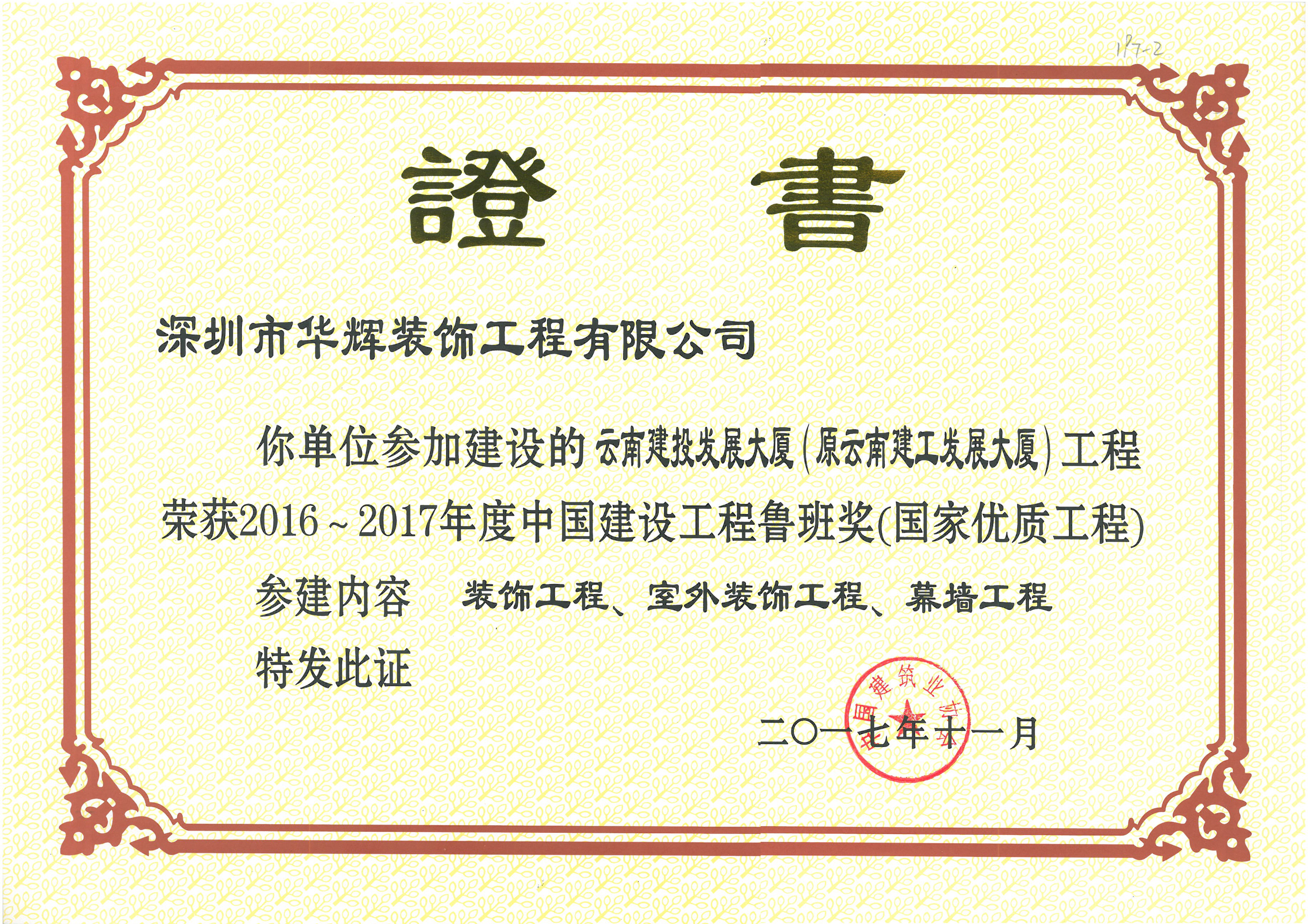 近日,中國建筑業(yè)協(xié)會發(fā)布2016~2017年度中國建設(shè)工程魯班獎(國家優(yōu)質(zhì)工程)評選結(jié)果,深圳市華輝裝飾工程有限公司承建的云南建投發(fā)展大廈(原云南建工發(fā)展大廈)工程獲獎。